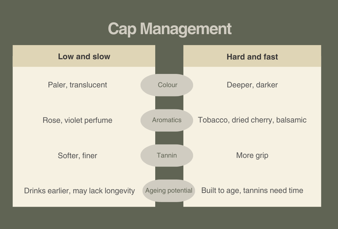 This decision is not just about fermentation technique - it’s about flavour, texture, and the kind of wine you want to drink in a few years’ time. A gentle approach gives us lighter colour, silkier tannins, and more delicate aromatics. These wines are seductive and ready to drink sooner, but they may not have the backbone to last decades. A powerful approach creates wines of density, tannic grip, and serious ageing potential - but these wines may need years to loosen up and soften the edges.