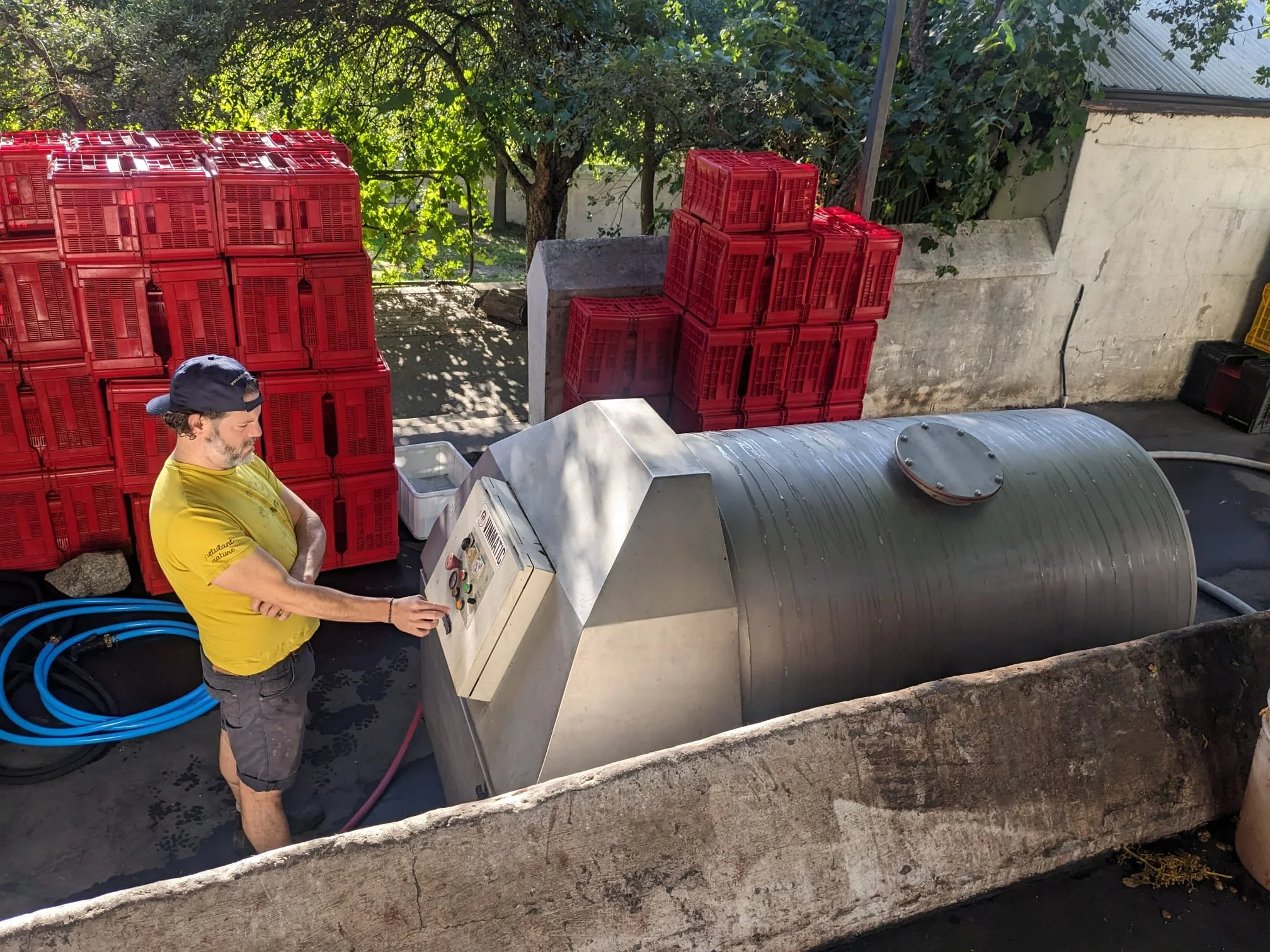 There have been a few exceptions. In the United States, we made much larger volumes and so could use a bigger pneumatic press, but we only bottled what we needed. At Badenhorst in South Africa we had a small, slightly charming pneumatic press (it was a simple easy-to-use machine, pictured above, which makes it difficult to explain José’s confused face). Slovenia was the opposite, a proper relic of a basket press, but it worked beautifully. A reminder that good fundamentals of slow pressure can yield as much as shiny equipment. Australia was pneumatic again, but with a twist—we pressed after a larger load, and left the skins in there to help build pressure more effectively.