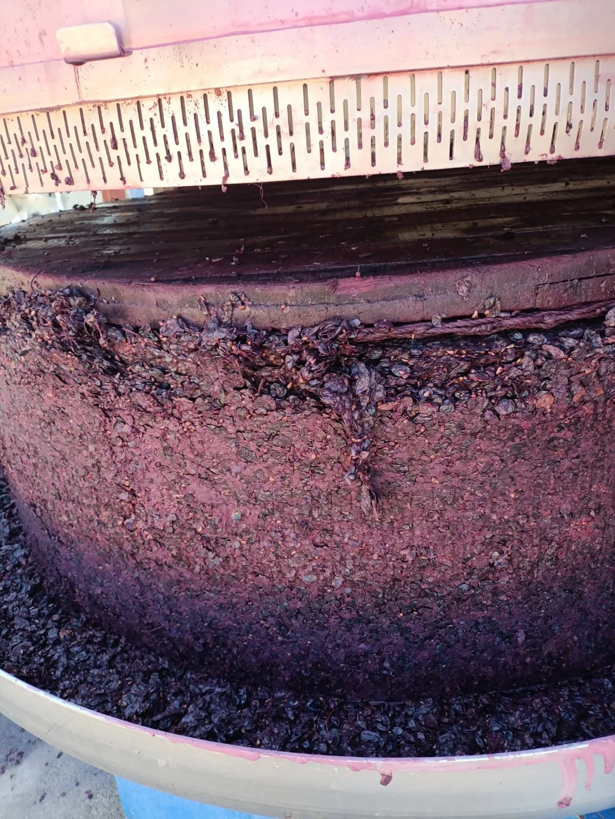 Different presses shape the wine in different ways. Basket presses (vertical presses, as pictured here) are the classic small-lot option: slow, manual, and relatively gentle. They tend to give cleaner, softer press fractions but are labour-intensive. In between press cycles, getting in and breaking it up before pressing again, an action known as crumbling is significantly harder than with a pneumatic press.
