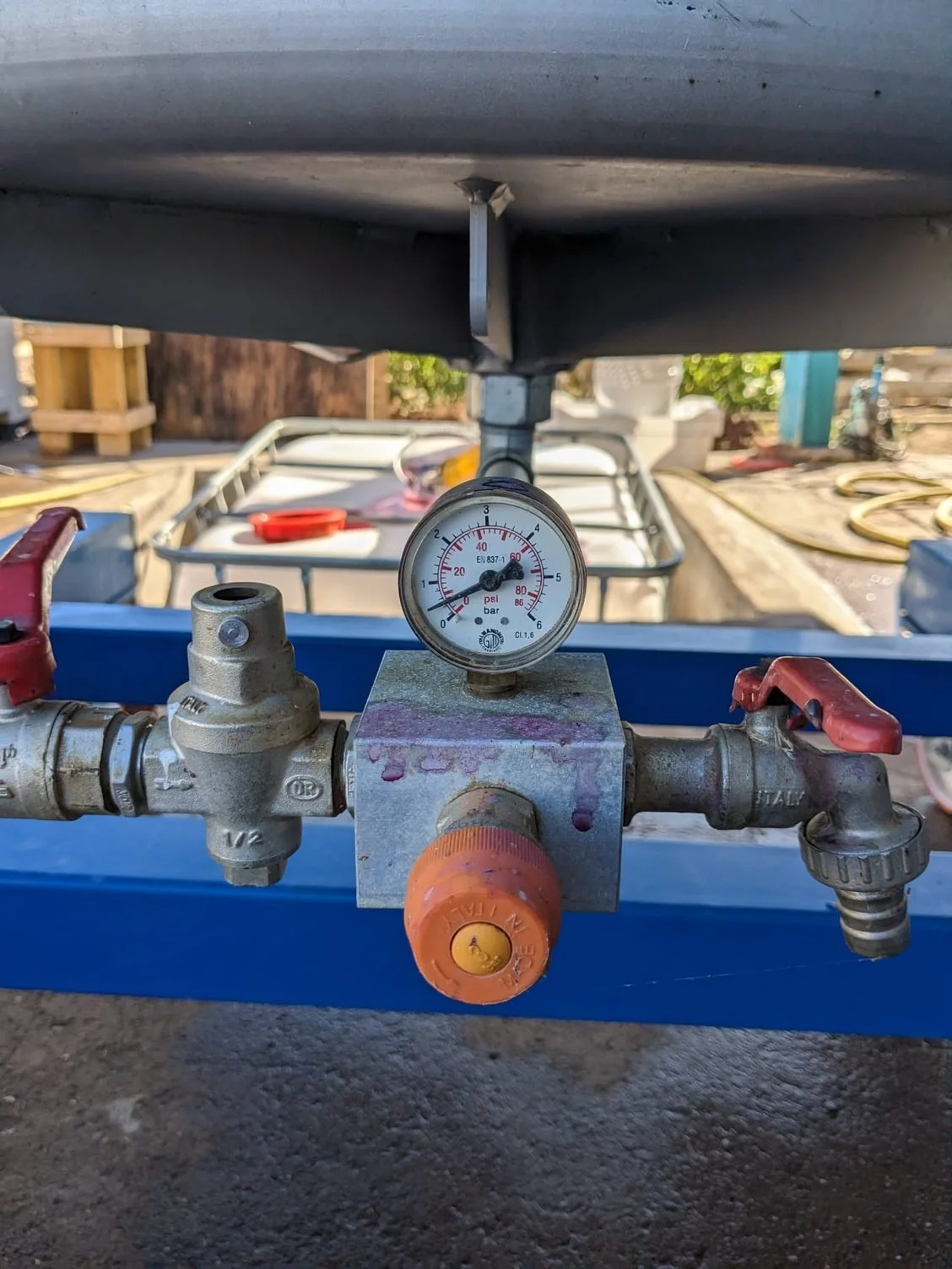 Pressing reds usually starts by draining the free-run wine by gravity or via pump from the tank. The remaining skins and seeds (a.k.a. the marc or pomace) are then transferred to the press, either pumped across or, for smaller lots like ours, lifted in with a spade.