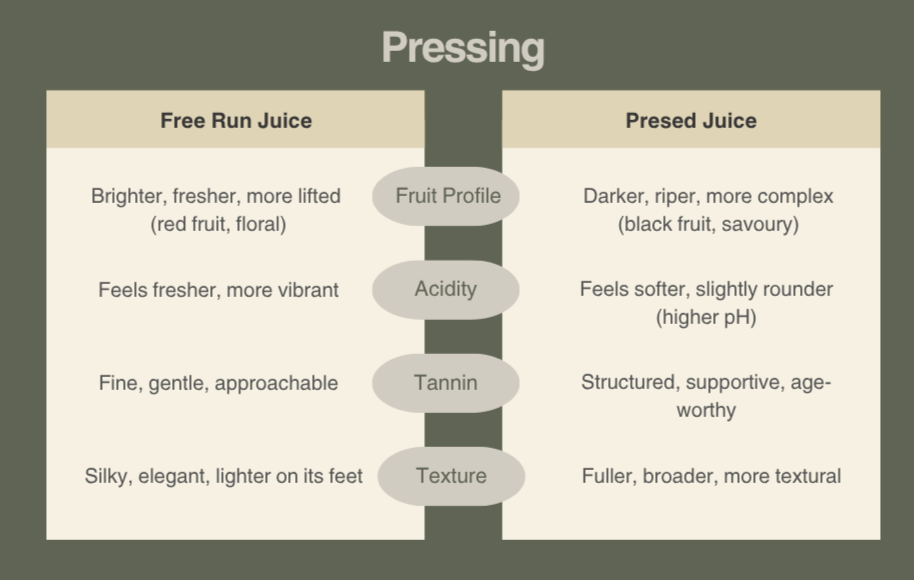 Pressing is the moment where extraction stops and timing is everything. Done well, it adds structure, depth, and completeness. Done poorly, and it runs the risk of hardening the wine; raising pH, increasing astringency, and masking fruit. The goal isn’t just to maximise yield, although it helps economics, it’s the final opportunity to dial in structure and tannin before committing the wine to barrel.