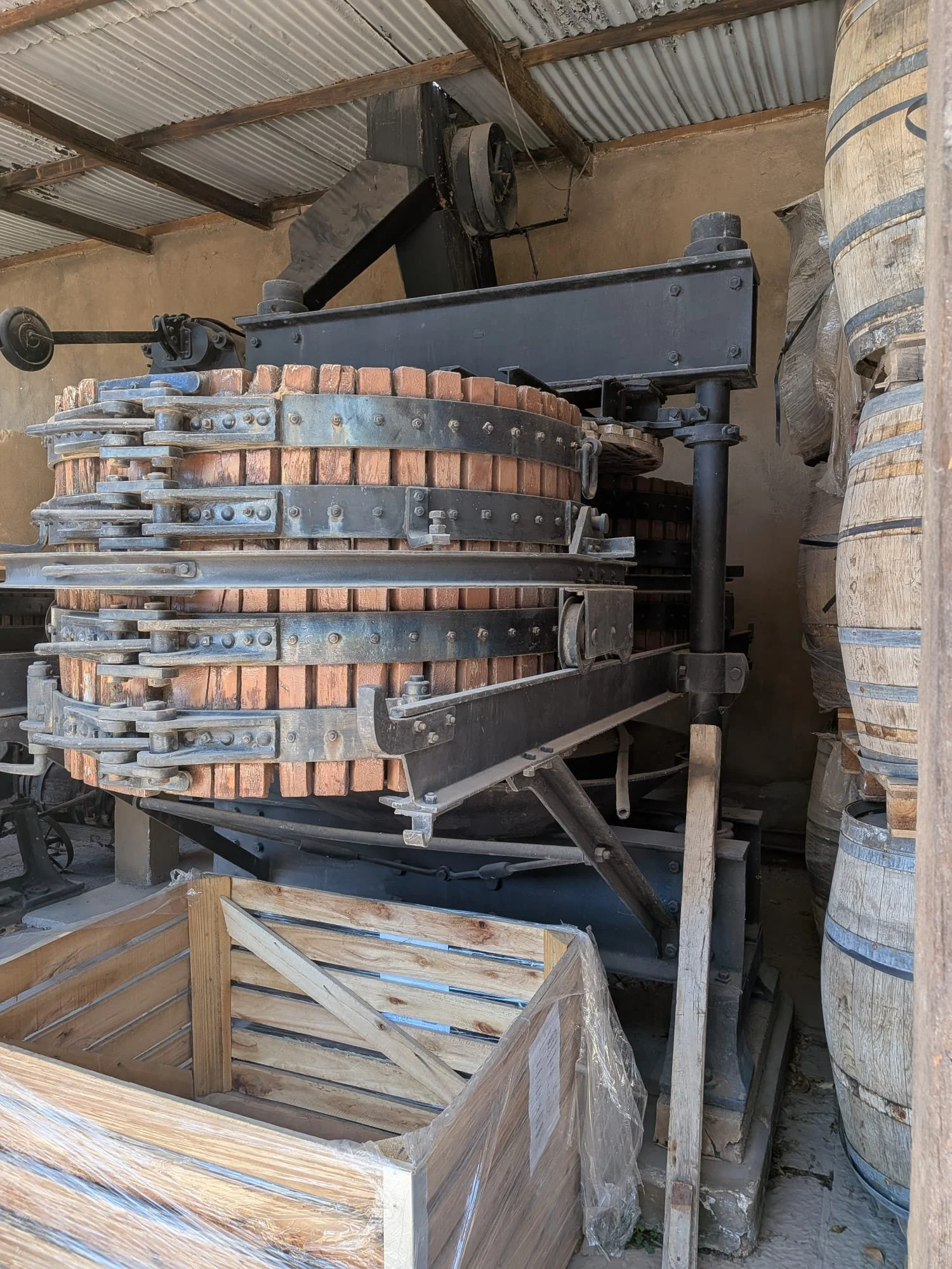 Pneumatic presses dominate modern wineries. They use an inflatable membrane to apply controlled pressure in cycles, with those key rotation (“crumble” cycles) to redistribute the solids. They’re efficient, consistent, and can be run under inert gas, helping reduce oxidation. The trade-off is that the crumbling motion, whilst extracting more yield, is a little harsher on the skins.