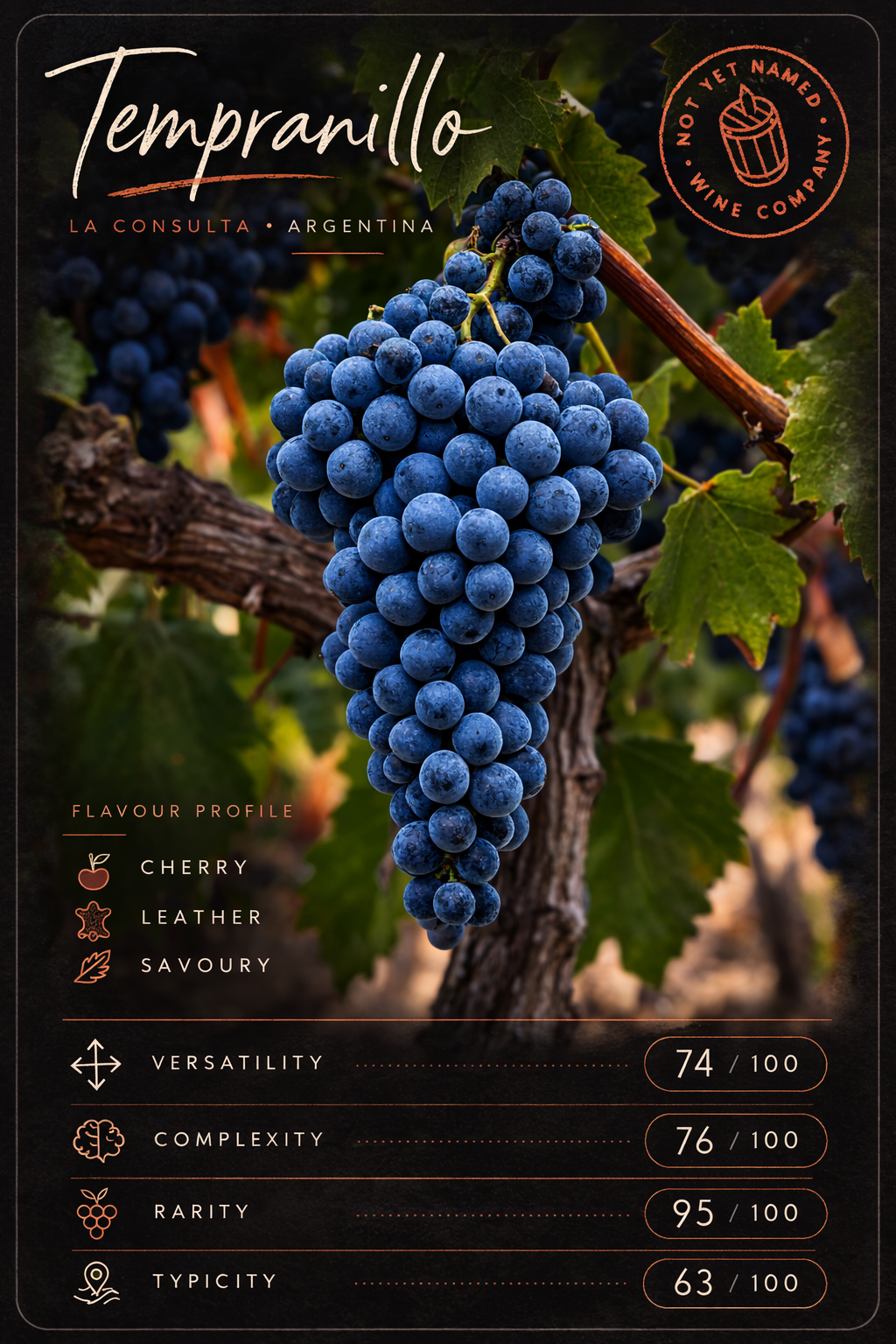 Tempranillo is Spain’s historic flagship grape, forming the basis of Rioja and Ribera del Duero, where it is prized for producing structured wines that age forever in, often American, oak. It was also one of the first varieties planted in La Consulta, making it something of a heritage grape of the region alongside Semillon and Malbec. An early ripener by nature, Tempranillo suits sunny climates well, developing classic flavours of cherry, savoury depth and subtle leathery complexity as it matures. Other than Spain it is rarely seen elsewhere, although as a little insider hint… I’m currently looking at Spain for Vintage #9 albeit very much Garnacha territory, so this scores well for rarity in that context.