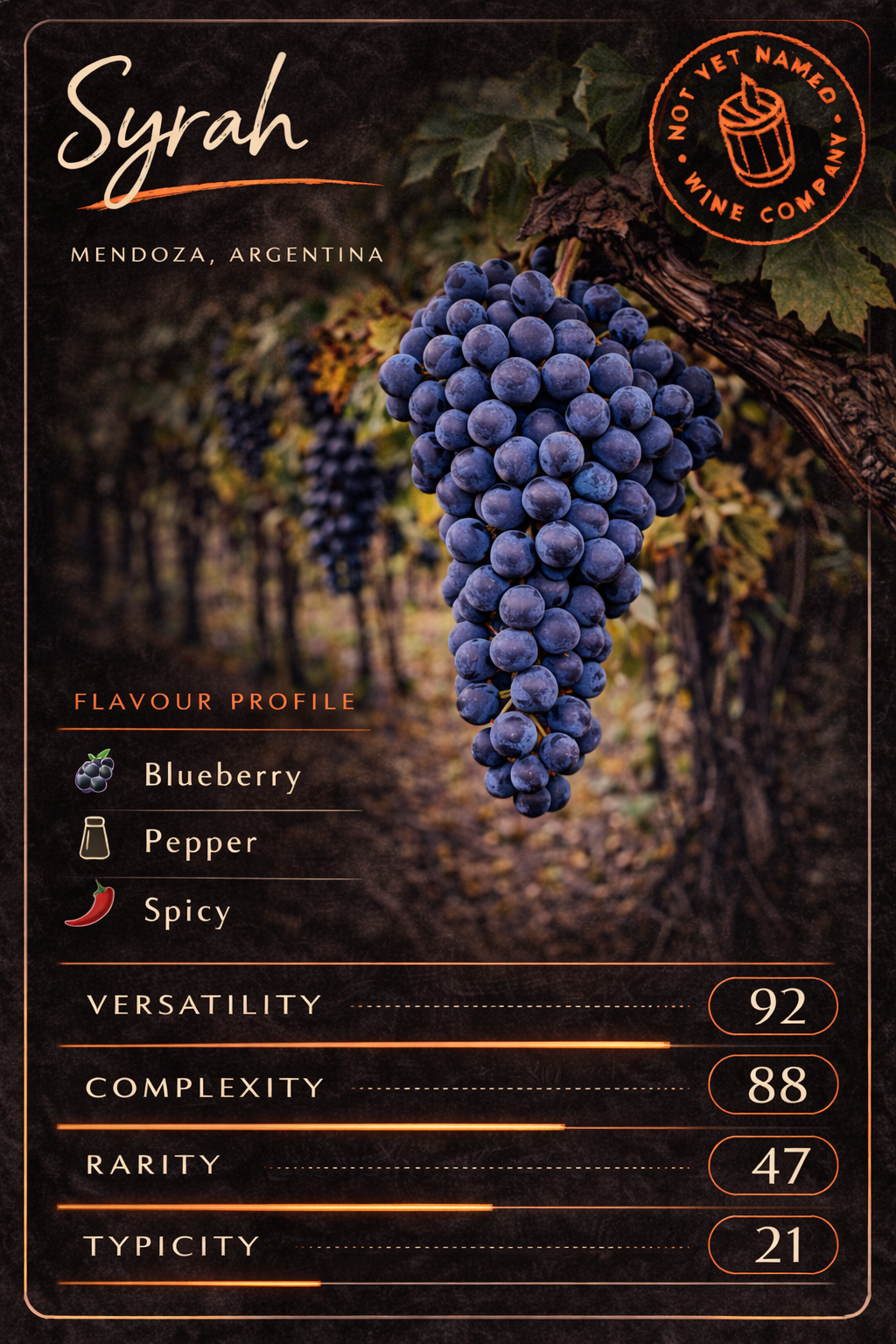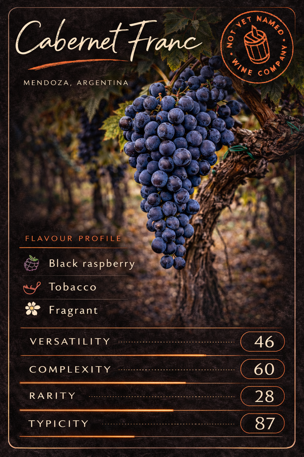 The classic, and one we’ve not yet made. Perhaps because it’s the opposite of rare, it’s planted almost everywhere and produces some of the world’s most famous wines, from Bordeaux to Napa. It’s generally well loved but perhaps not so fashionable right now, often overshadowed by lighter bodied varieties. In the glass it delivers consistently; blackcurrant fruit, firm structure and the cedar depth that comes with ageing. It gets a cruel ranking on versatility as it’s unmistakable however it’s made. So the question is whether Cabernet Sauvignon finally gets its moment… or whether it will remain Not Yet Named’s perennial bridesmaid.