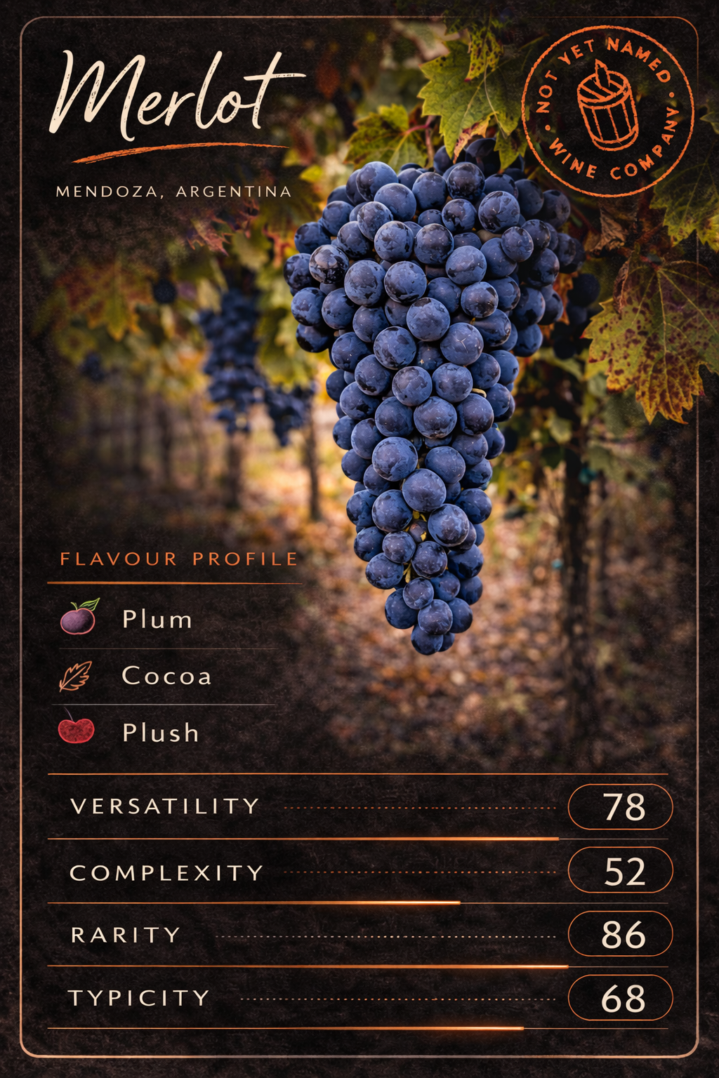 How could we come here and not offer Malbec. The grape has some French fame in Cahors and Bordeaux, but Argentina is where it took off, becoming the country’s defining variety thanks to the high-altitude vineyards of Mendoza. I’ve scored it surprisingly highly for rarity on the card; that’s not because Malbec is rare in Argentina, but because I suspect opportunities for us to make one in the future will be few. It also ranks well for versatility, which isn’t necessarily intrinsic to the grape itself, but here in Mendoza winemakers have become masters at shaping it into different styles.