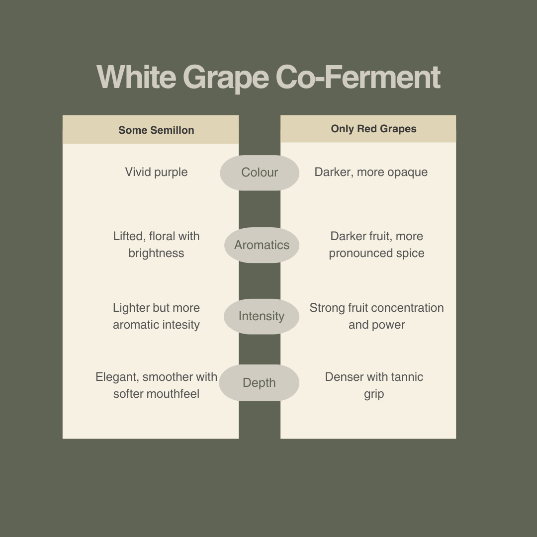 Co-fermentation is when two (or more) grape varieties ferment together in the same vessel, at the same time. It’s quite different from blending finished wines, and the chemistry behaves differently, particularly when white grapes are involved.