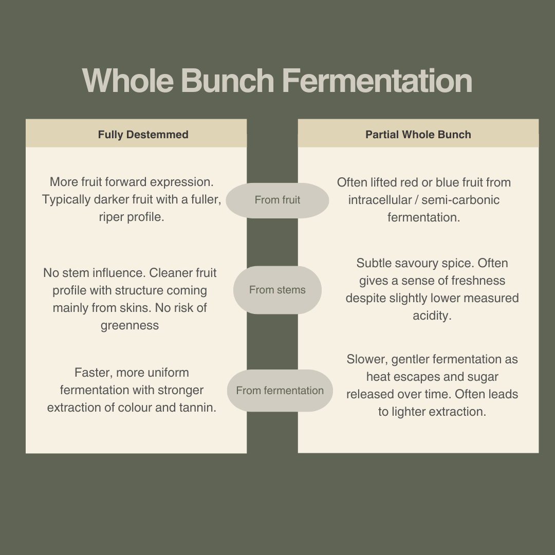 This process tends to produce wines with a different aromatic profile. The fruit can become prettier, more lifted and sometimes slightly blue-fruited, with a lighter, more perfumed character. It’s one of the reasons whole bunch fermentation often makes wines feel a little more delicate, even when the grape itself is quite powerful.